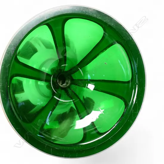 baluster form with long green glass panels showing, leafy scroll gilt highlights. H.326mm.