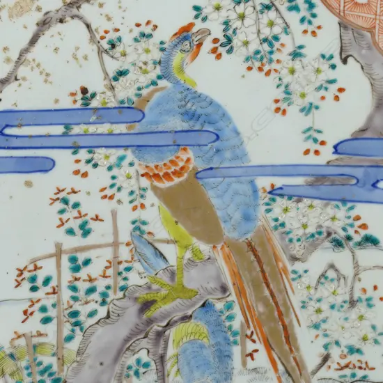 finely enamelled and gilded with exotic birds on and under a blossom branch in an extensive landscape. Animals and birds decorate the panelled border. Chamfered corners. 395 x 395mm