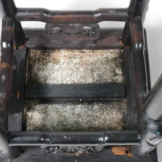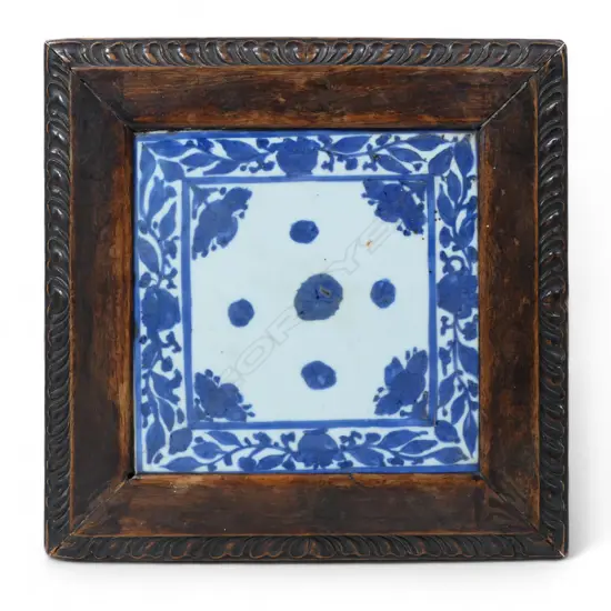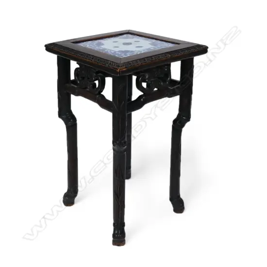 the top set with a Chinese blue and white tile, gadrooned edge, the apron decorated with sacred bats, the legs carved as bamboo. 280- x 280 x 450mm.