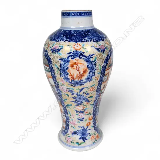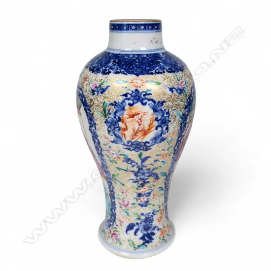 finely painted with panels of traditional figures in courtyard settings on a leafy and floral ground with gilt scroll highlights. H.255mm.
