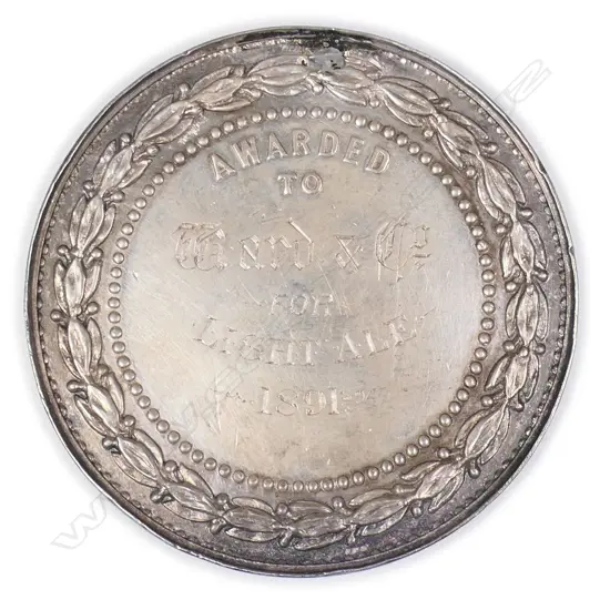 'AWARDED TO WARD & Co. For Light Ale 1891'. Dia.56mm. Drilled and plugged. A note included saying: WARD & Co. 1854-1955 ( from 1923 part of NZB) claims to be the oldest established brewery in Canterbury. In 1881 became a public company after being sold to Douglas and Lee in 1867. In 1890 Ward's took over the City Brewery and Malthouse from Vincent & Co. Wards continued brewing up until 1955.