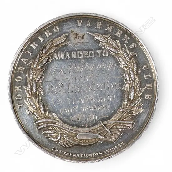struck in silver (47mm), by G. & T. Young, Dunedin & Timaru. Reverse cast and inscribed 'Awarded to D & A McPherson For Best Leicester Ram (3 Years Old) (And Upwards).