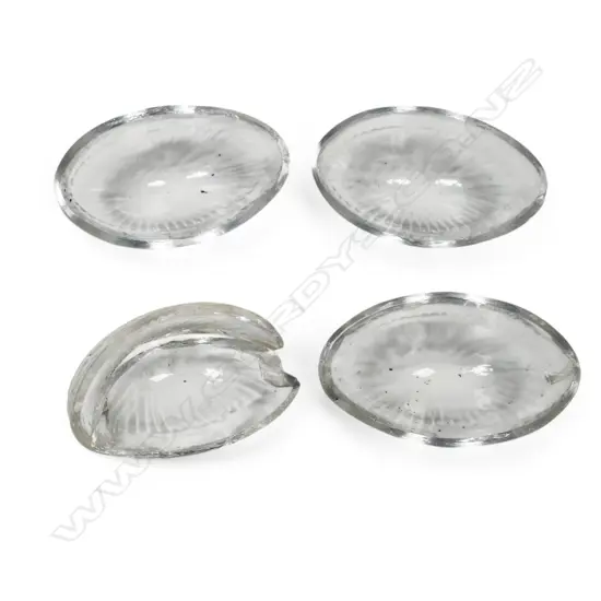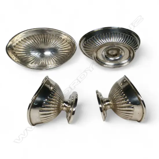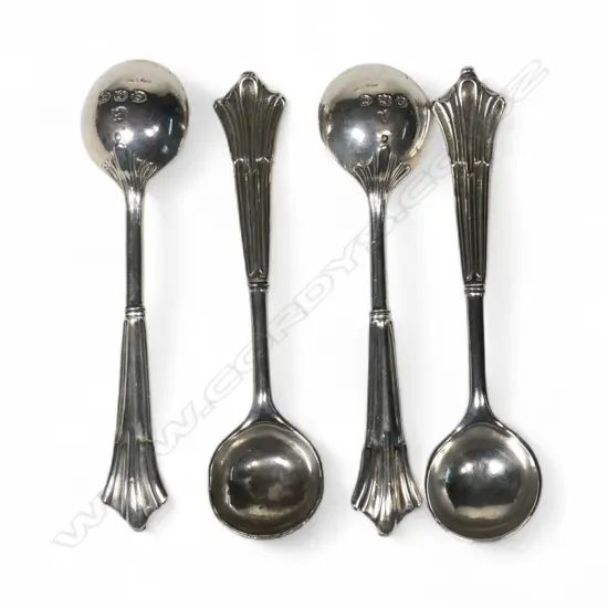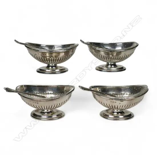 boat form gadroon bodies with clear glass liners (one broken), the spoons in the Albany pattern. All in fitted octagonal leather covered and red velvet and silk lined box showing some distress. London 1891 by Robert Stebbings. Silver weight approx. 160gms.