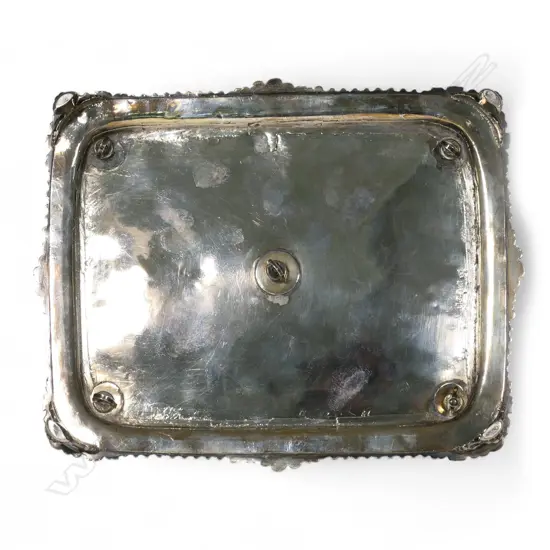eight cut crystal bottles, five with silver tops, central carrying handle, gadrooned rim to base, raised on paw feet. (Old damage and repairs). London 1809 by William Pitts & Joseph Preedy. 1000gms. (stand only). Purportedly once the property of Prime Minister 'King Dick' Seddon.