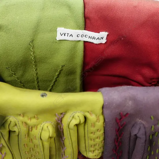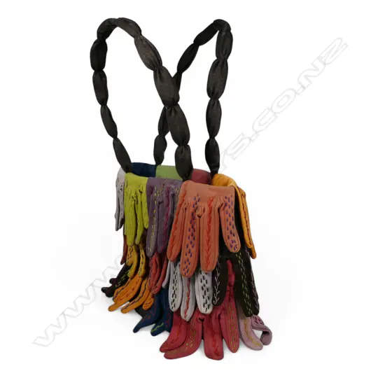 covered with vintage gloves, each with embroidered detail. Artist's label to interior. 300 x 400mm. Note: Illustrated front cover of 'carried away - bags unpacked' by Auckland Museum 2019. A copy of this book being sold with this lot. Private collection Auckland.