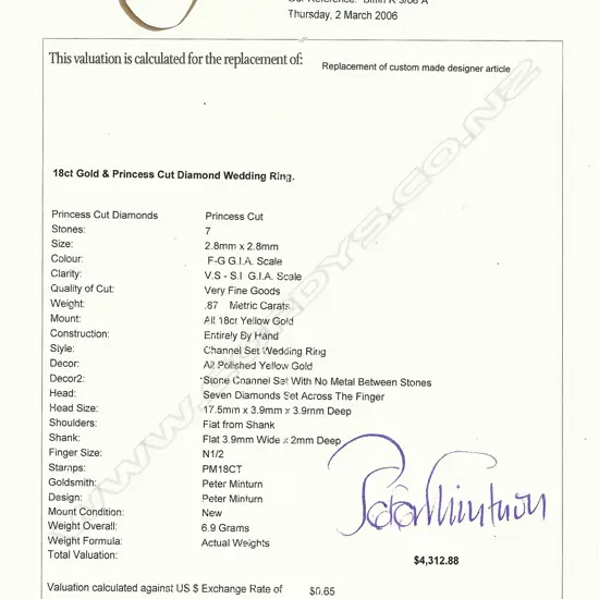 seven princess cut diamonds channel set to the top of a substantial band. TDW. 0.87ct. Ring size N½. 6.90gms. Valuation available.