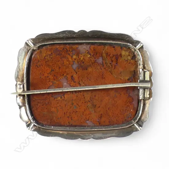 the oblong panel set in a repeating diamond pattern with various stones including malachite. Leafy scroll engraved serpentine frame. 48 x 38mm. 20.6gms. Provenance: The estate of Patricia Osborne - Christchurch.