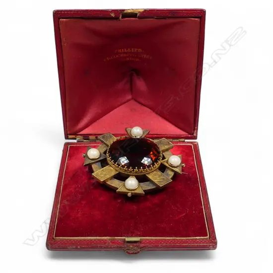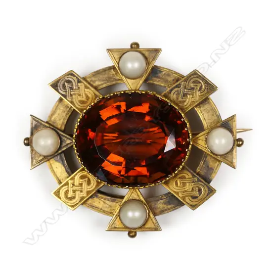 set with a large citrine upon an X-frame with engraved Celtic knot designs, on an oval ring with four triangular sections set with cultured pearls. Testing 9ct to 15ct gold. 27.6gms. In original fitted box, not quite closing.