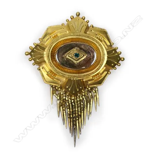 set with a central small facet cut emerald on a diamond form on a plain polished oval panel. The framing radiating panelled forms with fine rope twist and bead highlights. A wide tapered tassel fringe to the base. A glazed panel to the reverse. 16gms. Provenance: The estate of Patricia Osborne - Christchurch.
