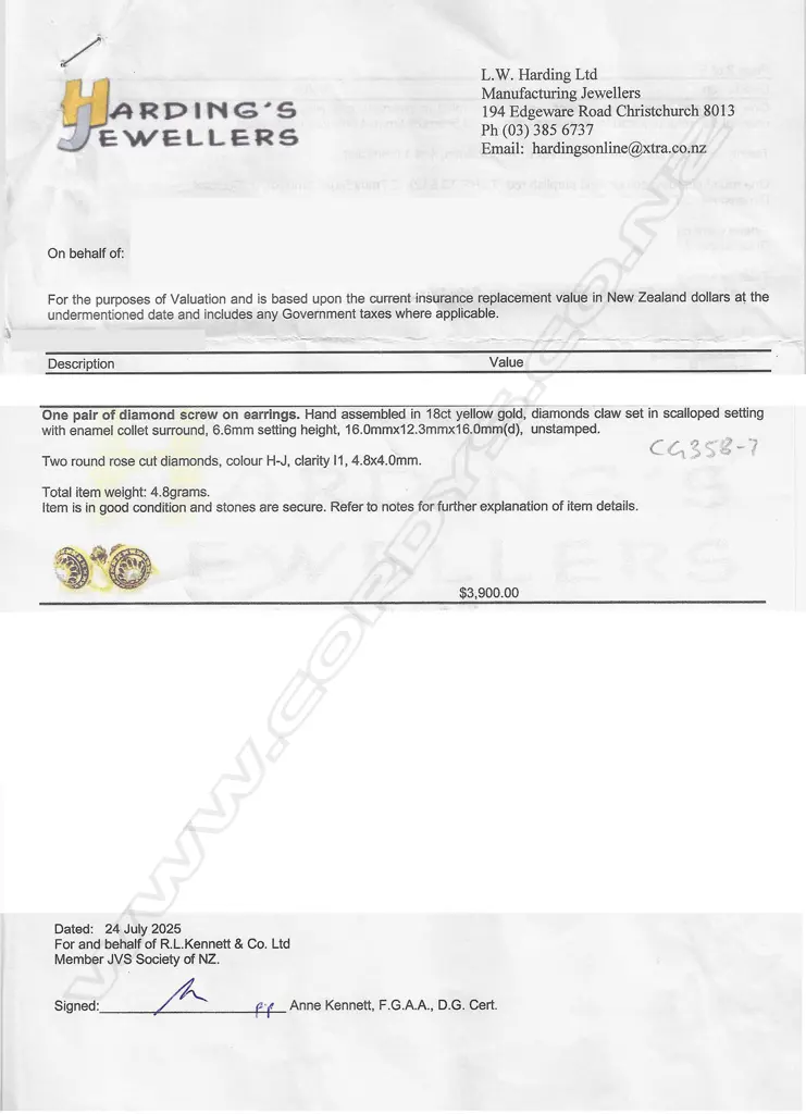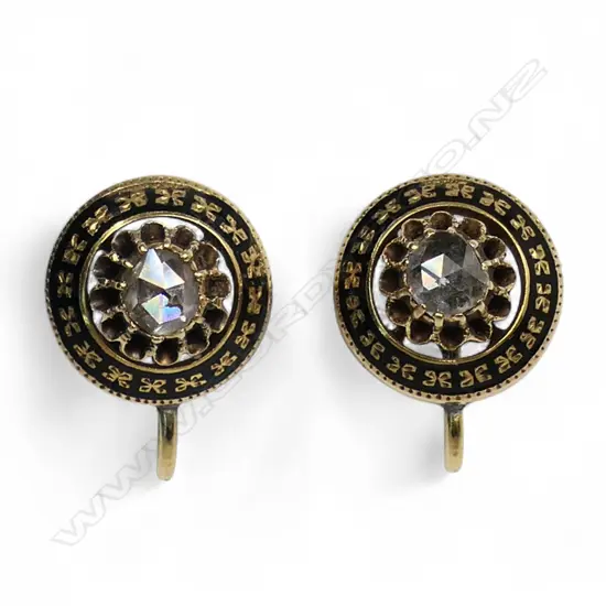 the round frame decorated in black enamel with an old rose cut diamond (Colour H-J, Clarity I1), multi claw set to the centre. Screw fittings for non-pierced ears. Valuation available. Provenance: The estate of Patricia Osbourne - Christchurch.