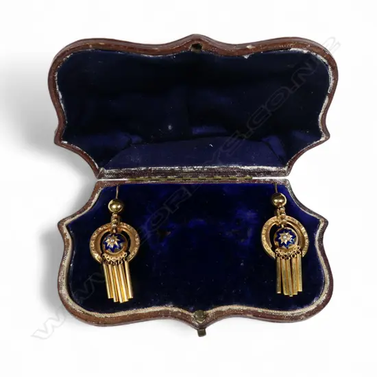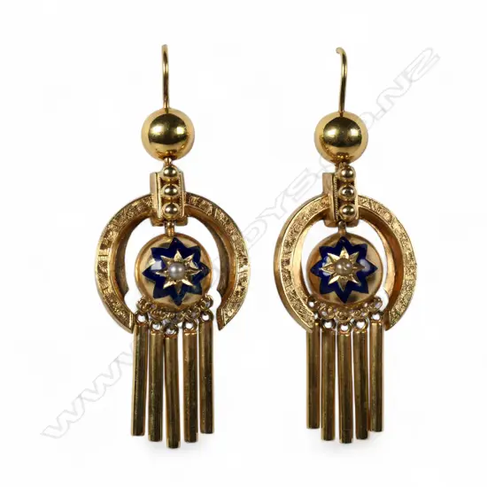 the central dome with blue enamel star burst framing a pearl, framed by an open crescent, with five tassel rods suspended below. All suspended from a half dome and hooks for pierced ears. Testing 15ct to 18ct gold.11.65gms. In a shaped Morocco leather box with space for a brooch, not present.