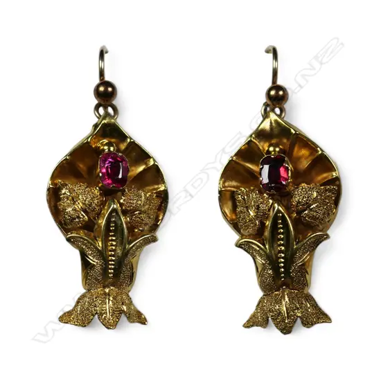 the delicate floral design with a red stone to the centre, hooks for pierced ears. 3.2gms. Provenance: The estate of Patricia Osborne, Christchurch.