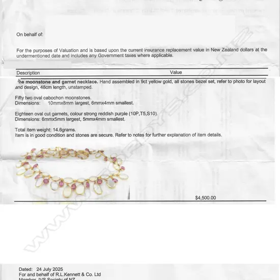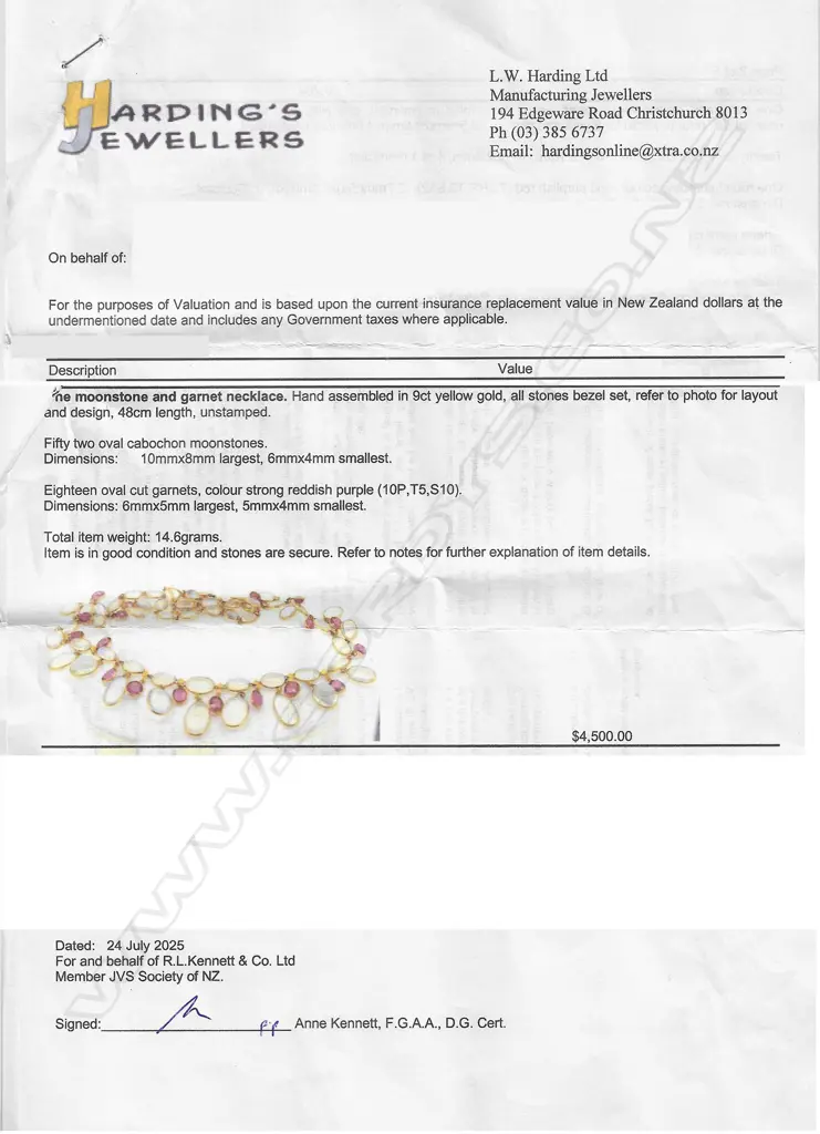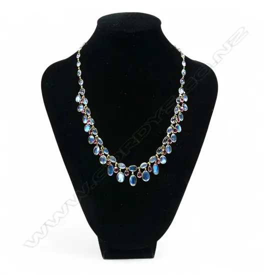 thirty-three oval graduating moonstone cabochons bezel comprising the chain with nineteen oval graduating moonstone cabochons alternating with eighteen oval cut purple-red garnets suspended from the necklace. L. 480mm. Valuation available. Provenance: The estate of Patricia Osbourne - Christchurch.