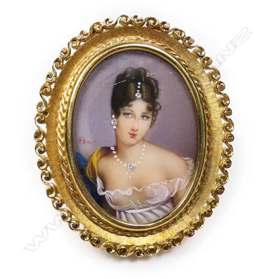 the elegant young diamond bejewelled woman wearing a diaphanous blouse. Open scrolling border. Hinged pendant bail and brooch pin to the reverse. 13.39gms. Provenance: The estate of Patricia Osborne - Christchurch.