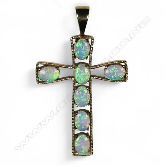 the frame set with seven milk opal cabochons, gold bale. 4.67gms.