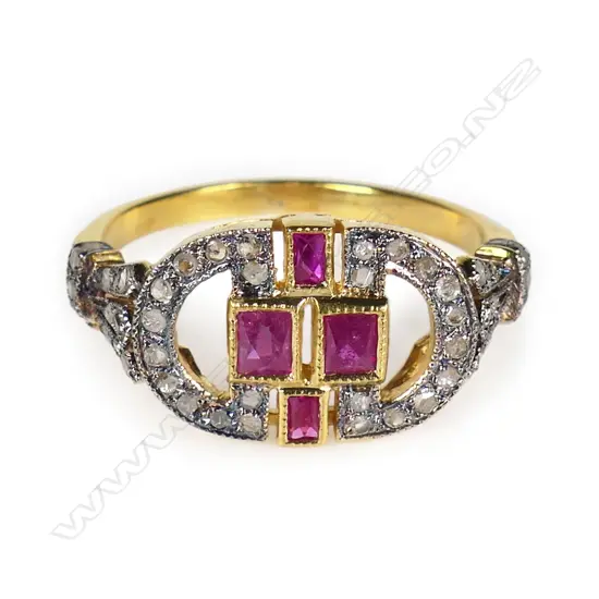 the mount set with old rose cut diamonds and four square cut rubies in a cross pattern, with further old rose cut diamonds to the triple split shoulders. TDW. 0.30ct. TRW. 0.21ct.
