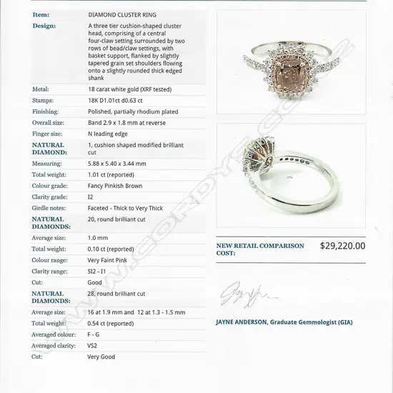 a 1.01ct cushion cut fancy pinkish brown diamond claw set in rose gold and surrounded by a halo of round brilliant cut diamonds (Colour very faint pink, Clarity SI2-I1), claw set in rose gold, with further diamonds (Colour F-G, Clarity VS2) to the shoulders. TDW. 1.65ct. Ring size N. Valuation available.