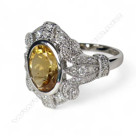 the 2.21ct oval cut golden yellow beryl (minor inclusions), bezel set with the scrolling mount and shoulders embellished by forty-six round brilliant cut diamonds (Colour I-K, Clarity SI2-P2) bead set. TDW. 0.57ct. Ring size N.