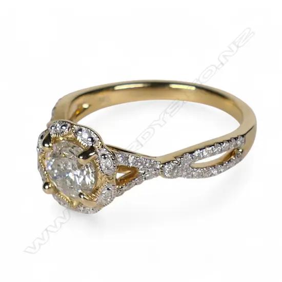 A 0.71ct round brilliant cut diamond (Colour I-J, Clarity P1-P2), claw set and surrounded by round brilliant cut diamonds with further diamonds to the band. TDW. 0.92ct. Ring size N½.