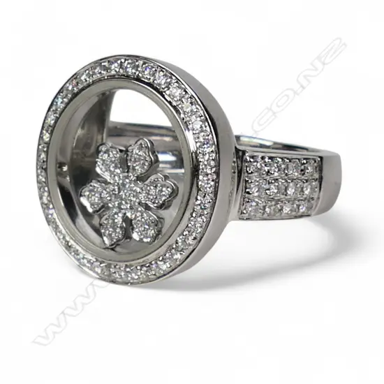 the centre with a floating diamond set snow flake shaped cluster under glass, surrounded by a halo of round brilliant cut diamonds with a triple row of diamonds set to each shoulder. TDW. 0.47ct. Ring size N.