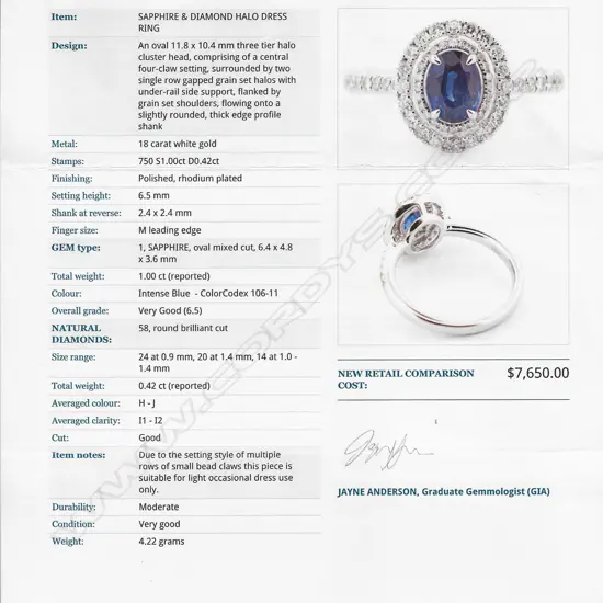 a 1.00ct oval mixed cut intense blue sapphire claw set and surrounded by a double halo of round brilliant cut diamonds (Colour H-J, Clarity I1-I2), bead set with further diamonds to the shoulders. TDW. 0.42ct. Ring size M. Valuation available.