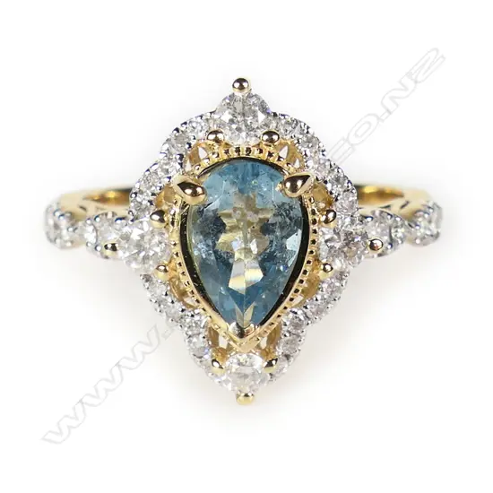 a 0.75ct pear cut medium blue aquamarine (moderate inclusions), claw set and surrounded by a scalloped halo of round brilliant cut diamonds (Colour H-I, Clarity SI-I2), with further diamonds to the shoulders. TDW. 0.56ct. Ring size N½.