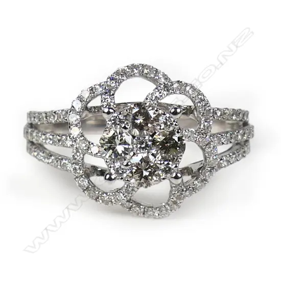 the central floral design and triple band shoulders set with ninety-three diamonds round brilliant cut diamonds. TDW. 0.89ct. Ring size N.
