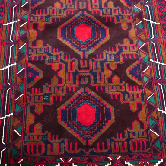 the field decorated with three colourful diamonds, surrounded by geometric designs, multiple border guards. 1900 x 1200mm.