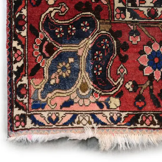 the red ground field with a central floral ivory ground medallion framed by floral sprays, the main wide border guard with two narrower guards framing, salmon pink, blue, yellow and other tones. 2600 X 3600mm.