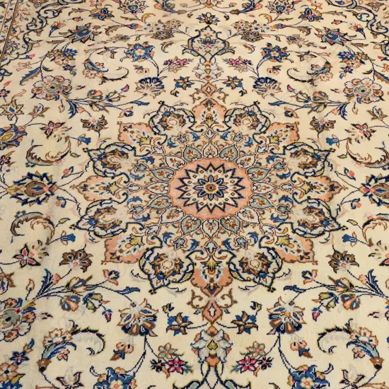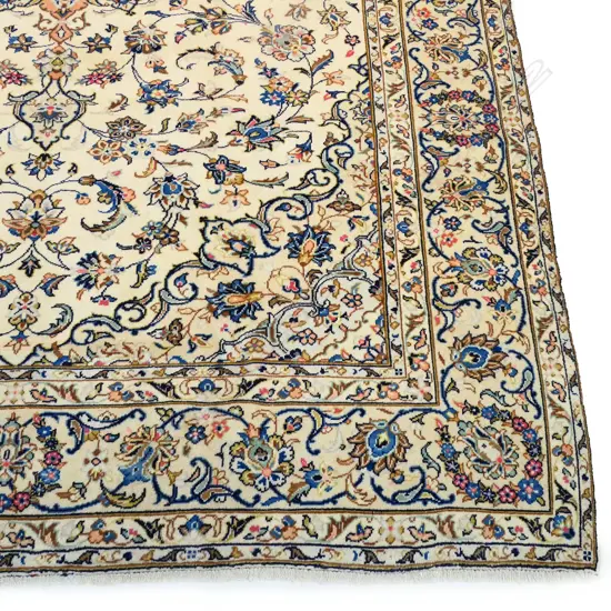 the field decorated with a central geometric and floral medallion, surrounded by trailing vines and flowers, the quadrants with conforming decoration, multiple border guards. Bright colours on an ivory ground. 3400 x 2450mm.