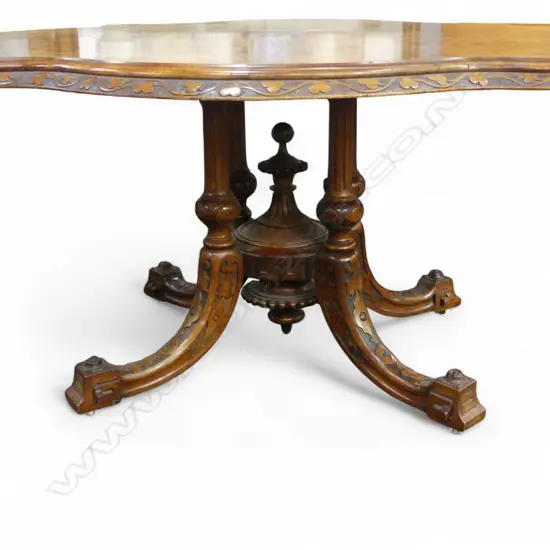the serpentine top with book matched quartered veneered burr walnut top on a cathedral pedestal four-legged base.