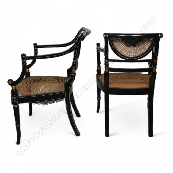 caned back panels and seats, one chair requiring cane repair, the backs with painted quiver of arrows and bow highlight, the frames with gilt detail.