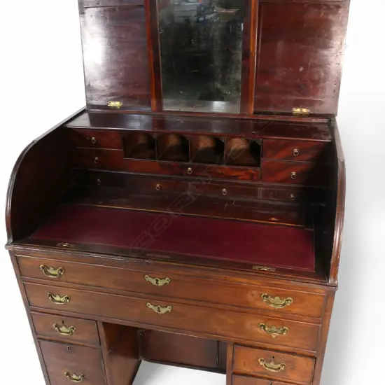 the interior with drawers and pigeon holes, a slide that reveals storage space, the leather writing insert lifts to reveal the drum, the top of bureau also lifts up to allow the internal mirror to be used. The base with two faux full width drawers over the pedestals each with small drawer and cupboard, a cupboard is also in the knee cavity. Each side of the bureau also with a small cupboard. This is possibly a campaign desk as there are fittings for carrying handles to each side (one handle absent). Raised on bracket feet. 930 x 630 x 1030mm.