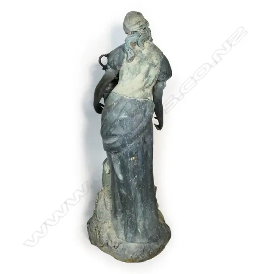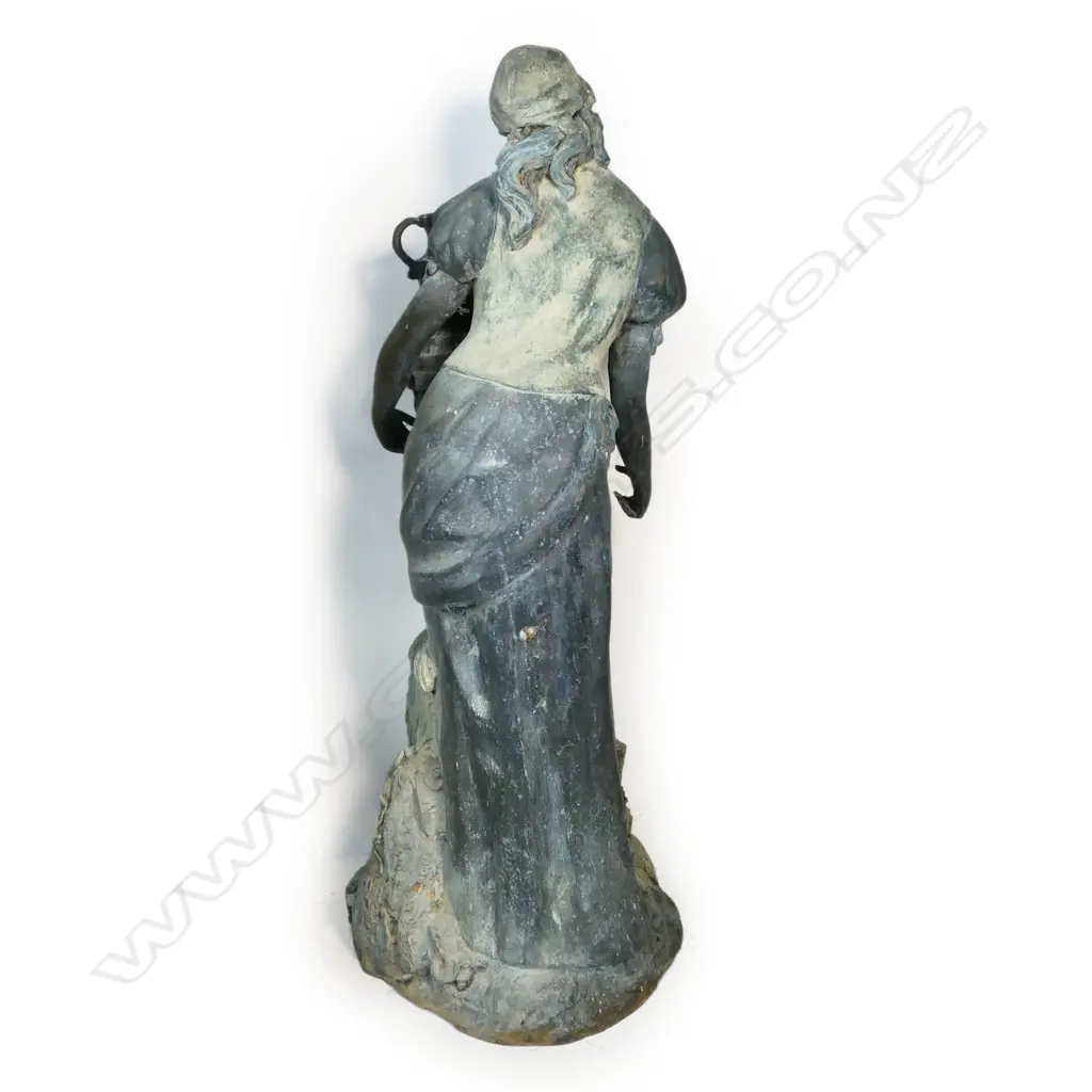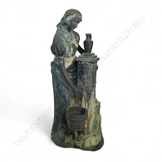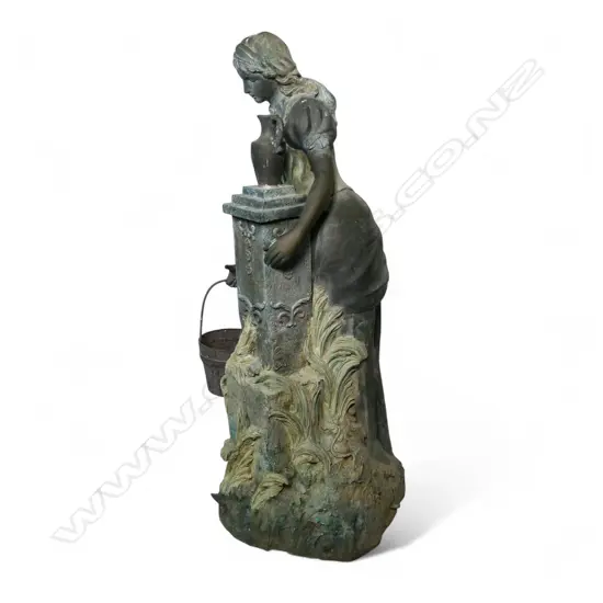 the young woman with semi open blouse, slightly bending, towards the bearded mask fountain tap on the square column well head, foliage issuing from the base. H.1400mm.