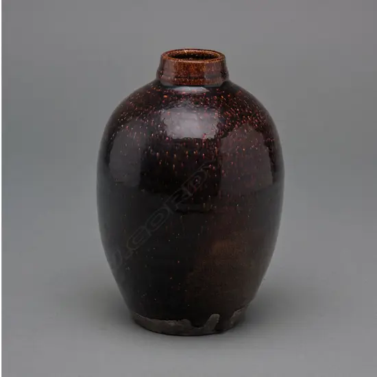 c.1950. Of black fired clay. Indented base, elongated ovoid body with a short, slightly tapering neck and narrow mouth. The whole excluding the resting surface and lower body dipped in a flecked tenmoku glaze. 15.5 x 10.6 cm.