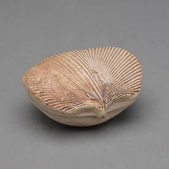 c.1980. White stoneware with an oval shaped body and striated shell-form cover. Blue glazed interior. 10.4 x 8.4 x 4.8cm