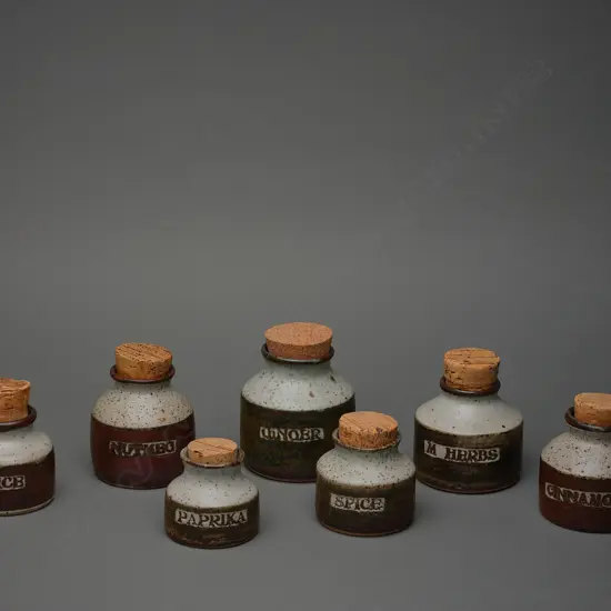 A set of seven Len Castle stoneware herb/spice jars,