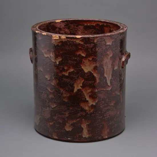 c.1900. Cylindrical body with lug handles and dipped in a mottled salt glaze. 30 x 27 cm
