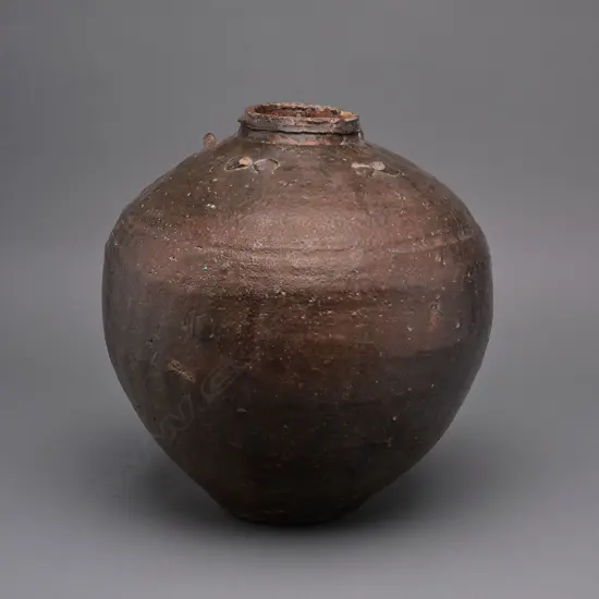 Late Edo period. A jar of orange brown coloured clay. Elongated ovoid shape with a thick, squared, everted ring mouth. Four lug handles set opposite on the shoulder, two missing. The whole, excluding the resting surface dipped in a textured matt brown glaze. Loss of two lug handles; loss of chips to rim. 35.4 x 32.2 cm. See: William Willetts, Ceramic art of SouthEast Asia (Singapore Southeast Asian Ceramic Society, 1971), pp. 7071, nos. 283 - 284 (for design and shape, respectively).