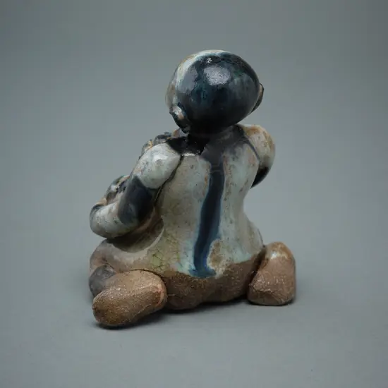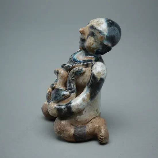 13th to 16thC. A brown stoneware figure of a kneeling man holding a cockerel in the crook of his left arm. The upper part dipped in a white slip and in under glaze black. 5.5 x 5.2 x 11.5 cm. A similarly decorated figure although unattributed to a particular site is illustrated in Roxanna M Brown, Legend and reality: early ceramics from South-East Asia (Cologne: Museum für Ostasiatische Kunst, 1977), no. 152. Acquired at Webb's Asian art June live sale, 13 June 2020, lot 266. Sold as 'A 14th Century Chinese Yuxi Kiln Blue and White Ceramics Statue’.