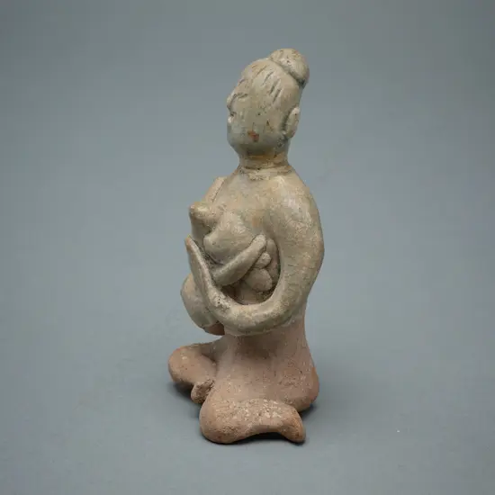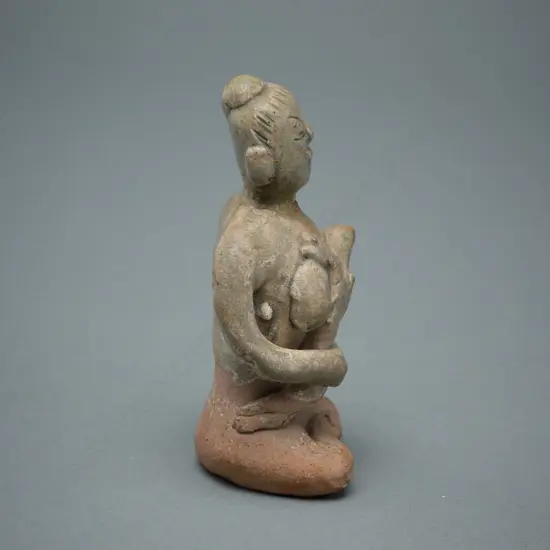 13th to 16thC. A pale brown stoneware figure of a nude woman with a topknot, kneeling and holding a child between her breasts. The celadon glaze applied roughly above her waist. For a comparable figure see: William Willetts, Ceramic art of Southeast Asia (Singapore: The Southeast Asian Ceramic Society, 1971), p. 70, no. 280. University of Malaysia collection; Willetts observes this figure 'came from the kiln site'. Dick Richards, South-East Asian ceramics: Thai, Vietnamese, and Khmer (Kuala Lumpur: Oxford University Press, 1995), p. 135, pl. 87 (Art Gallery of South Australia 708C188).
