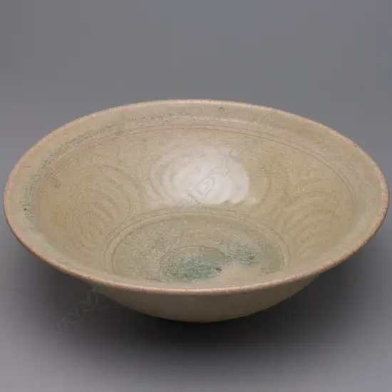 13th to 15thC. Formed of light red biscuit coloured clay. Indented base with a circular pentimento of a tubular kiln support. Integrated foot ring with wide curving walls and everted rim. The cavetto incised with a circle, the wall with a band of four combed lotus bud motifs bordered above and below by two incised lines. The whole, excluding the base and resting surface with a translucent craquelure glaze, pooling at the cavetto. Glaze generally abraded and crackled. 9.6 x 28.7 cm. Roxanna M Brown, The ceramics of South-East Asia: their dating and identification (Kuala Lumpur: Oxford University Press, 1977), pl. 31, no. 109; Dick Richards, Thai ceramics: Ban Chiang, Khmer, Sukothai, Sawankhalok (Adelaide: Art Gallery of South Australia), p. 69, no. 284; Dick Richards, South-East Asian ceramics: Thai, Vietnamese, and Khmer (Kuala Lumpur: Oxford University Press, 1995), p. 124, fig. 74 (Art Gallery of SA collection, 708C295)."