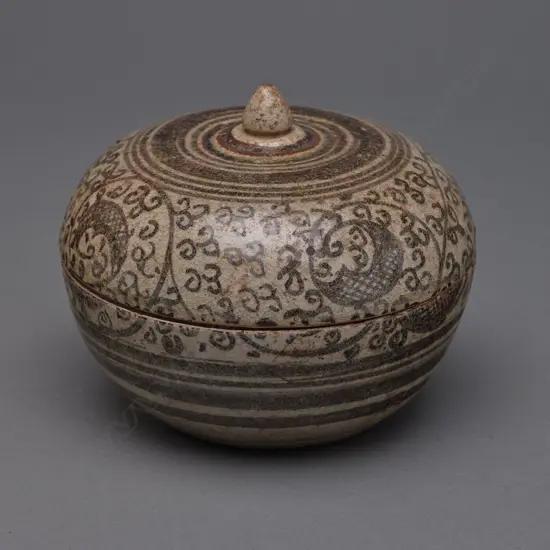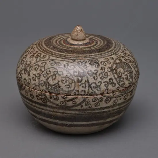 13th to 16thC. Formed of a greyish-buff clay. Indented base, integrated foot ring with a circular spur mark; a relief moulded ring around the lower, curving, wall; Turned rim. Flat cover with a pointed knop set on a double raised disc. The exterior of box and cover each painted with a wide band of scrolled 'ferns' bordered by circular bands. The box on interior and exterior excluding the base, resting surface and rim; the cover on the exterior. 11.8 x 14.1 cm. A comparable pieces are found in: William Willetts, Ceramic art of South-East Asia (Singapore: Southeast Asian Ceramic Society, 1971), p. 57, no.195-196 ; and Dick Richards, South-East Asian ceramics: Thai, Vietnamese, and Khmer (Kuala Lumpur: Oxford University Press, 1995), pp. 99-100, figs 41-42.