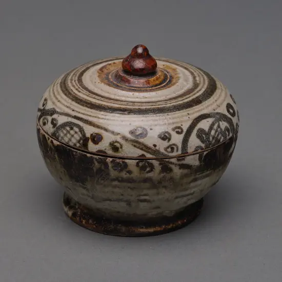 13th to 16thC. Of greyish-buff clay. Indented base with a circular spur mark; a waisted foot ring around the lower, curving, wall; Turned rim. Flat cover with a lotus bud knop set on a raised disc. The exterior of box and cover painted with a sinuous line undulating over three crosshatched circles on a reserved field of swirled dots (vegetal scrolls) edged by bands of circular lines. The painting smudged around the lower walls of the box. Glazed on interior and exterior of the box excluding the base, resting surface and rim, the cover on the exterior. Chip to rim of box. 8.3 x 9.5 cm. For comparisons see: Dick Richards, South-East Asian ceramics: Thai, Vietnamese, and Khmer (Kuala Lumpur: Oxford University Press, 1995), p. 99, figs 41 (Art Gallery of South Australia collection, 708C220) for the form; p. 91 pl. 33 (Art Gallery of South Australia, 708C255) for the decoration.
