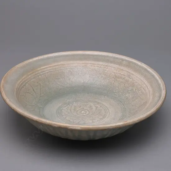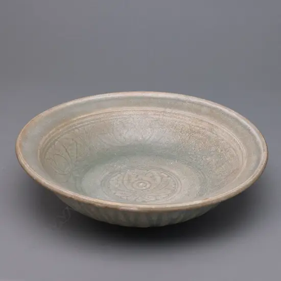 13th to 16thC. Made of a fine, greyish brown clay. Indented flat base with a dark brown circular pentimento of a tubular kiln support; integrated foot ring; wide curving wall with a sloping ledge and everted rim. The exterior wall with a band of vertical grooves running from footing to ledge. The cavetto incised with a lotus flower in profile bordered by double rings; the interior wall incised with a band of five incised peony flows and leaves bordered by triple rings. Excluding the base and resting surface covered in a celadon glaze. Glaze abraded. 6.7 x 26.1 cm See: "Dick Richards, South-East Asian ceramics: Thai, Vietnamese, and Khmer (Kuala Lumpur: Oxford University Press, 1995), p. 121, fig. 68 (Art Gallery of South Australia, 854C16). Richards observes: 'The design and decoration of this bowl is influenced by Chinese trade ceramics of the late Yuan and Ming dynasties. It is technically very well made.'