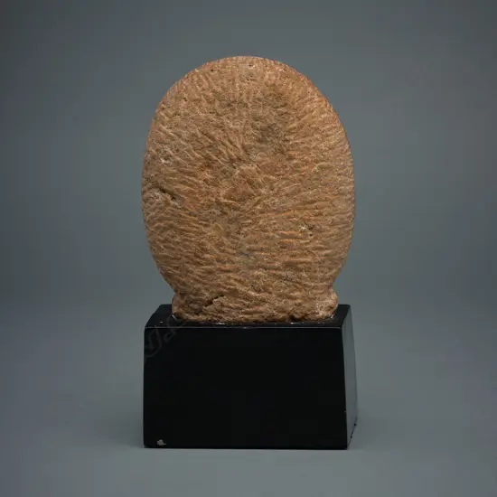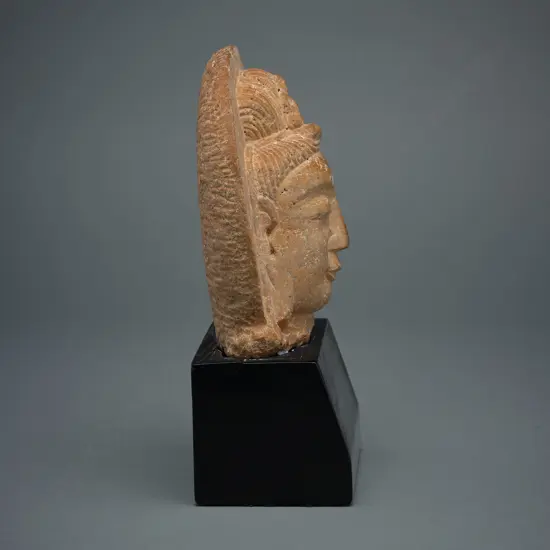 realistically carved in high relief, almond shaped eyes, the tied hair with small seated buddha. The head surrounded by a cusped halo with rounded back. Mounted on black ebony stand H.19.5cm