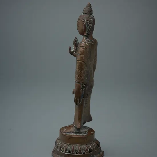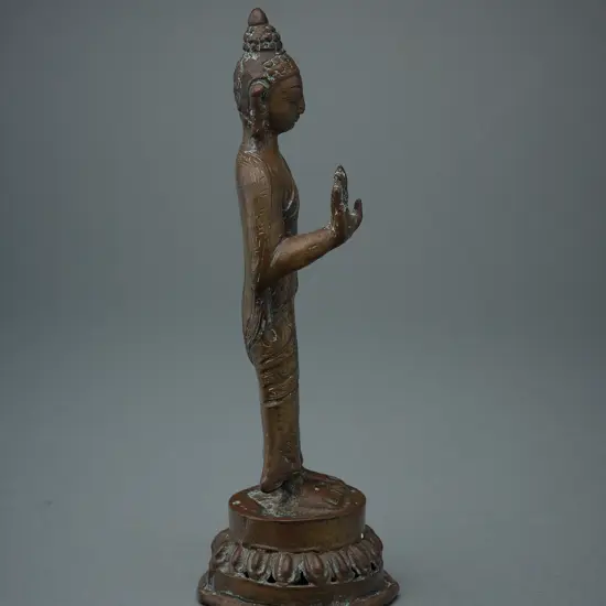 dressed in a long robe, his right hand facing the front with fingers raised. The head covered in curls. Raised on lotus plinth. H.17.8cm
