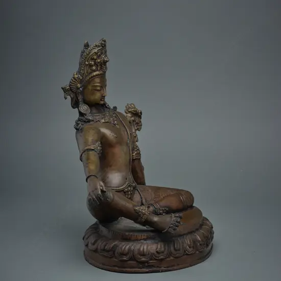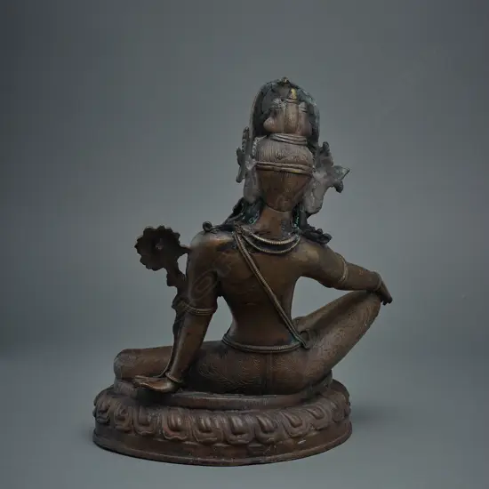 the seated Indra god traditionally represented on a lotus throne. Her left hand touching the earth, fingers shortened. H.31cm