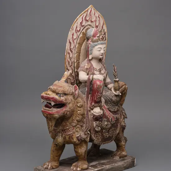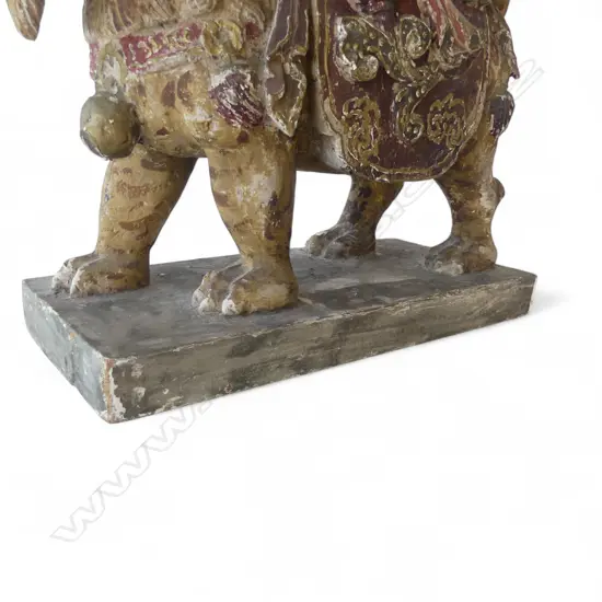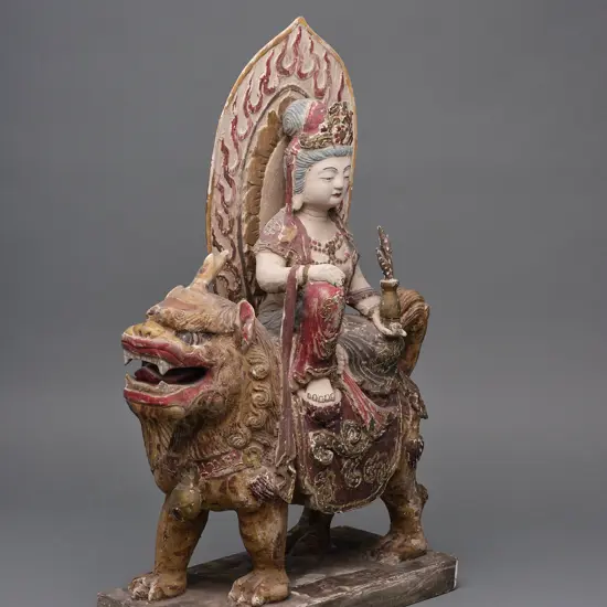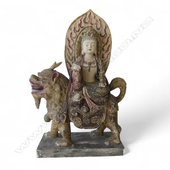 the bodhisattra Guanjin seated astride a mythical creature, carved wood polychrome painted. In flowing robe. Her left hand holding the vase with elixir of life. Fixed behind is the flaming mandorla. H.59cm. W.40cm.