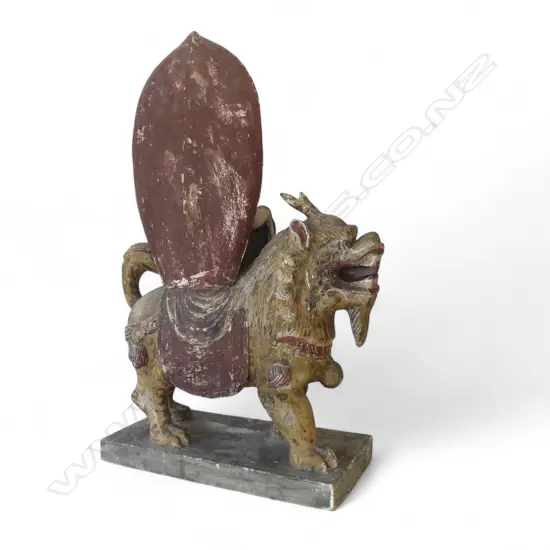 Chinese wood and gesso Buddha figure seated on mythological lion dog,